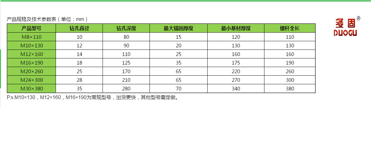 答:不止小规格非常规型号,多固DUOGU®生产过最大M56化学锚栓,如有需求可联系我们确认相应的定制时间。
