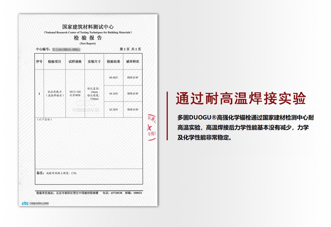 答:多固DUOGU®高强化学锚栓通过耐高温焊接检测,并可以为采购方提供相应的承载力报告,以及部分产品材质分析报告,多固DUOGU®也可以根据项目需求做一些其它类型的认证报告。